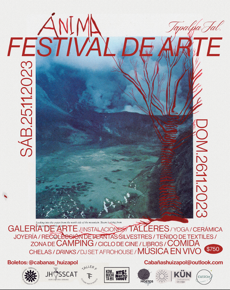 Cada seis meses se lleva acabo el festival de arte ÁNIMA, donde celebramos el arte local en espacios de completa naturaleza. La primera edición contó con la participación de más de 15 artistas, tuvo lugar en las cabañas Huizapol en Tapalpa, Jalisco. el sábado 25 y domingo 26 de Noviembre 2023.
